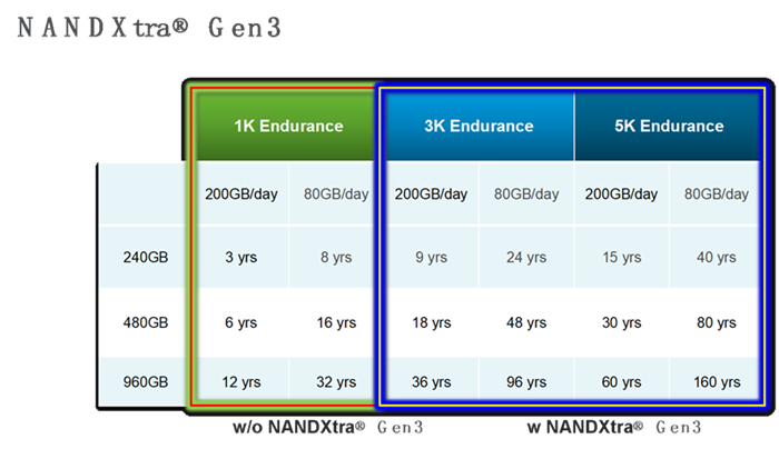 長(zhǎng)期的測(cè)試結(jié)果顯示,在NANDXtra® Gen3可靠性引擎的加持下,閃存顆粒平均使用壽命整體提升3到5倍,為采用QLC顆粒的SSD企業(yè)以及搭載使用QLC顆粒SSD的整機(jī)企業(yè)免去后顧之憂。