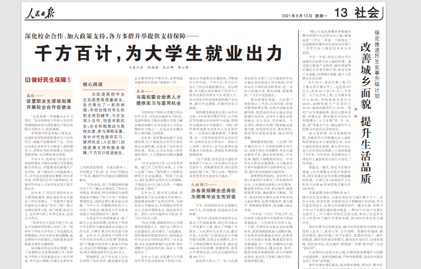 深化校企合作、加大政策支持,各方多措并舉提供支持保障—— 千方百計,為大學生就業(yè)出力 (做好民生保障⑤) 本報記者 祝佳祺 王云娜 李心萍 《人民日報》( 2021年09月13日 第 13版) 核心閱讀 為促進高校畢業(yè)生實現(xiàn)更高質量就業(yè),各方推出了一系列舉措:學校加強對學生的職業(yè)規(guī)劃輔導,與企業(yè)深入合作,創(chuàng)造求職機會;企業(yè)積極推動與高校共建,參與課程設置,有針對性地提供實習、留用機會;人社部門加強政策支...